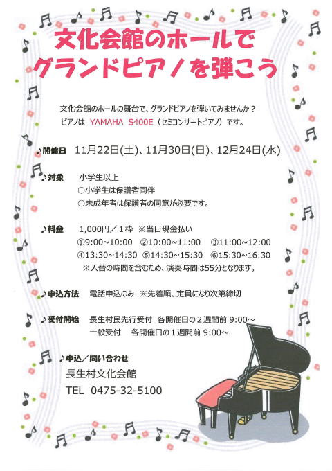 2 発表会や演奏会としてのご利用、レッスン料等を伴う営利目的の利用はお断りいたします。