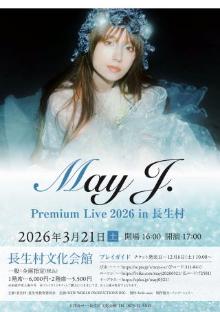令和8年3月21日(土)に長生村文化会館にて開催される「May J. Premium Live 2026 in長生村」チケットの販売は、販売予定枚数に達したため終了(完売)しました。