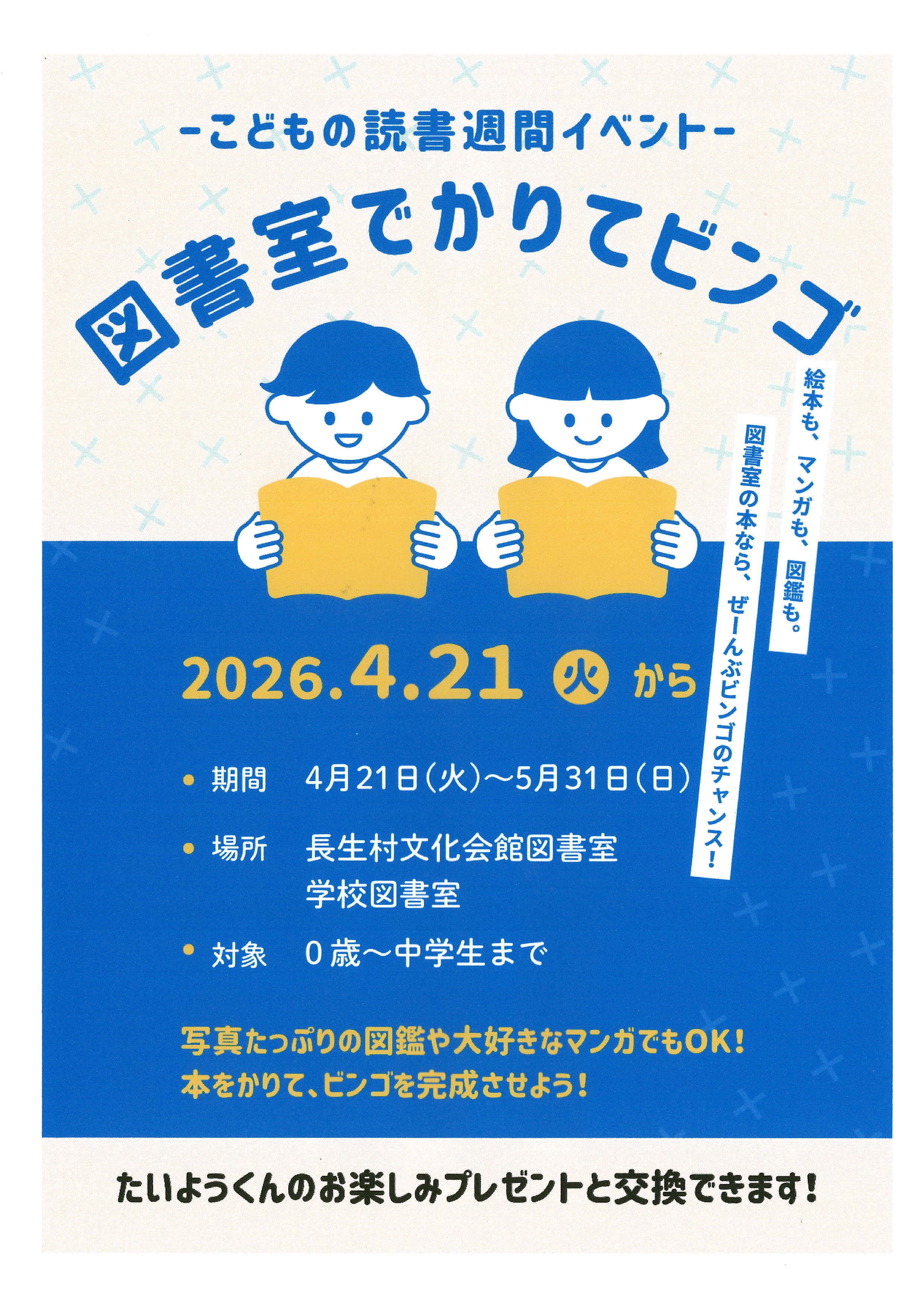4月21日(火曜日)~5月31日(日曜日)まで「図書室でかりてBINGO」を実施します。期間中、文化会館図書室及び交流センターでBINGOカード(就学前用、小学生用、中学生用)を配布します。